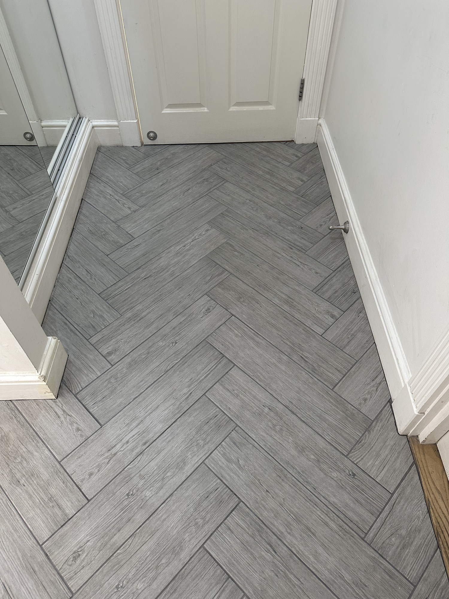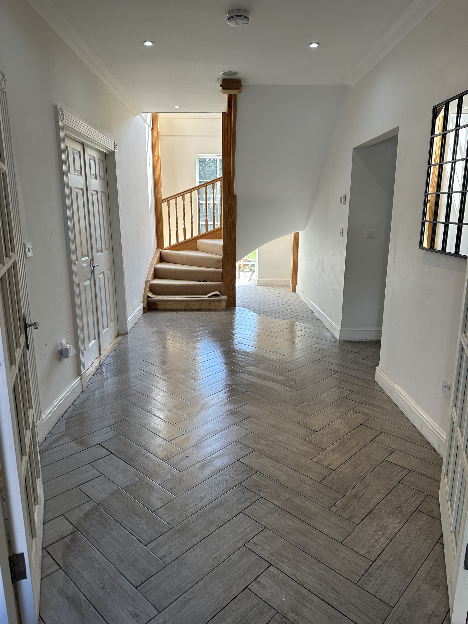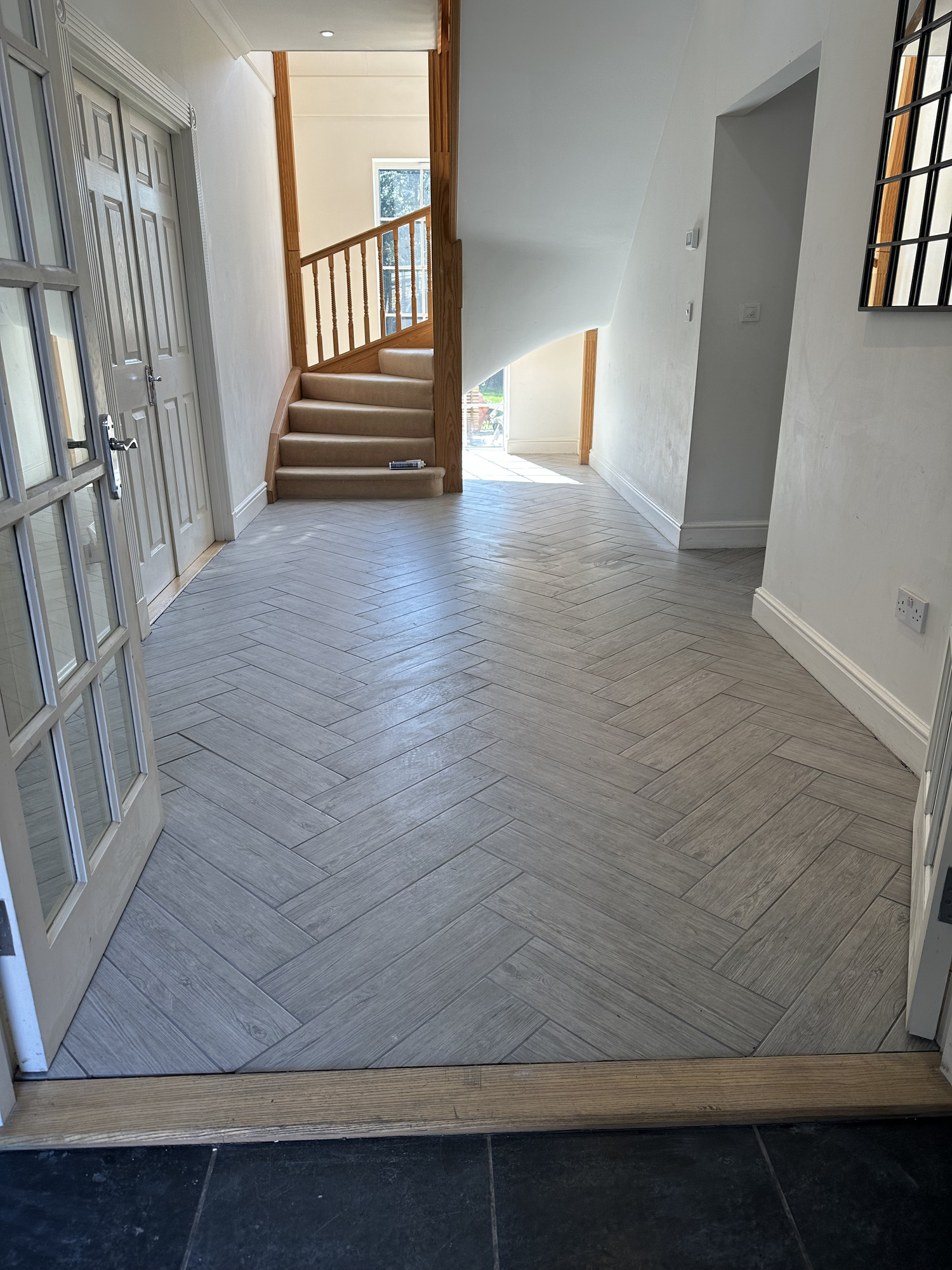 We completed this job using Light grey porcelain wood effect tiles laid in herringbone pattern.